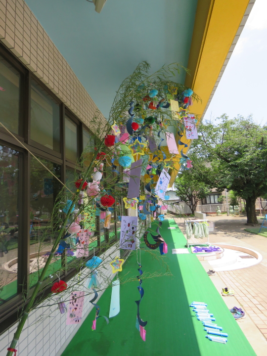クラスごとの色とりどりのたなばたかざりを楽しんだあと、自分で飾りつけをした小枝を切りとり家に持ち帰りました。