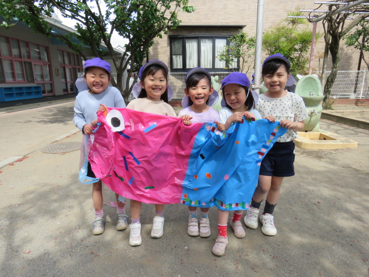 みんなで力を合わせて作った大きなこいのぼりが、園庭の青空を元気に泳いでいました。