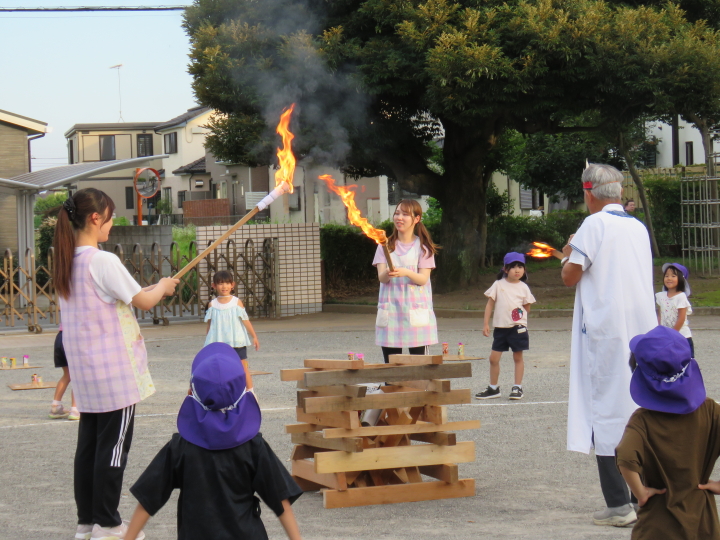 カレー作りや縁日ごっこ、キャンプファイヤーや花火などをして楽しい時間を過ごし、暗くなった頃におうちに帰りました。